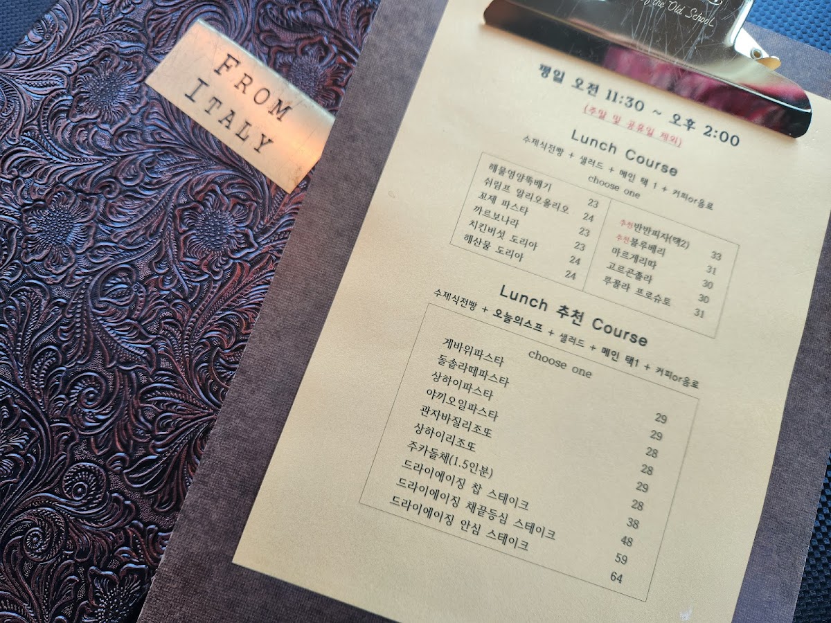 From Italy in Pocheon offers a delightful menu with a variety of options, making it a perfect spot for both lunch and dinner. The pasta selection includes the 게바위파스타, a flavorful dish that stands out with its unique ingredients and preparation. For those craving a larger portion, the 주카돌체 (1.5 servings) provides an excellent choice, packed with rich flavors and a generous serving size. The menu also features a range of pizzas and steaks, catering to different preferences. While specific prices are not mentioned, the variety of dishes, from hearty pastas to indulgent pizzas, promises a satisfying dining experience. Whether you're in the mood for a light salad or a hearty steak, From Italy’s menu delivers delicious options with an authentic Italian flair.